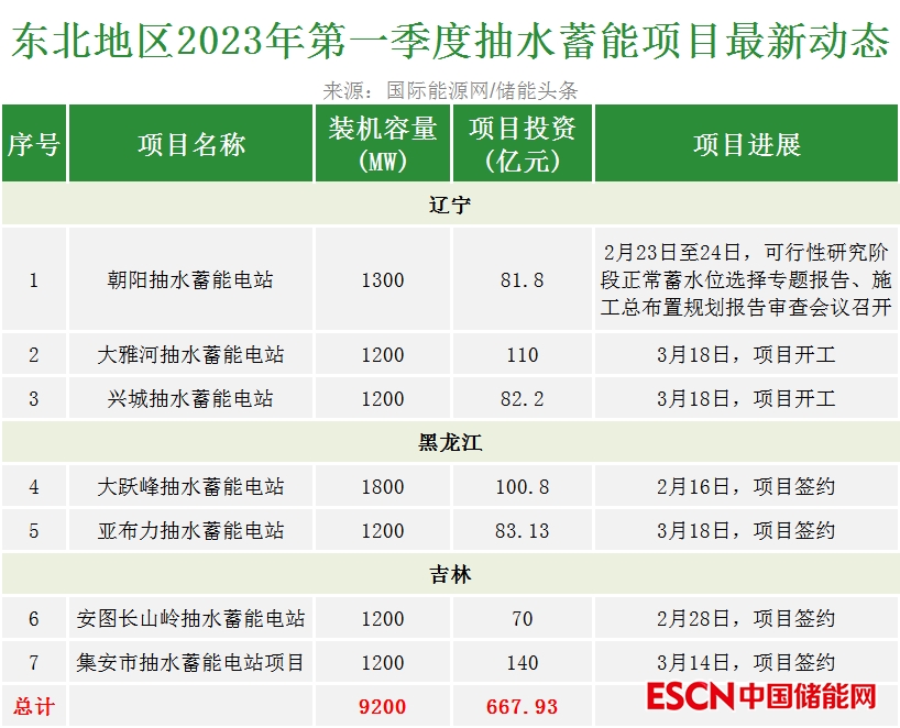 2023年一季度,東北地區(qū)有7個抽水蓄能電站更新了動態(tài),裝機總規(guī)模為9.2GW,項目總投資667.93億元。