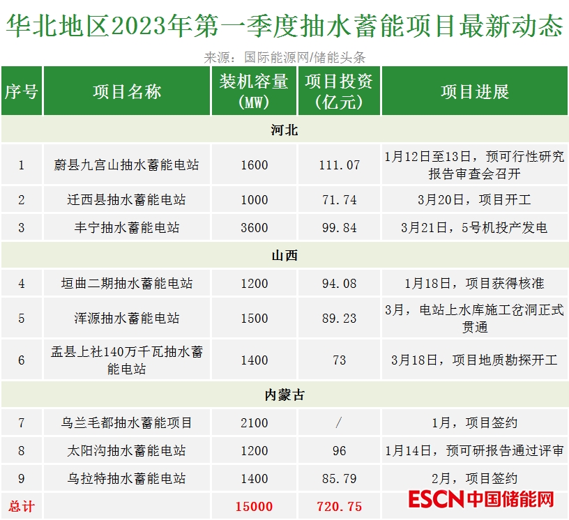 2023年一季度,華北地區(qū)有9個抽水蓄能電站有了新進展,裝機總規(guī)模為15GW,項目總投資720.75億元。