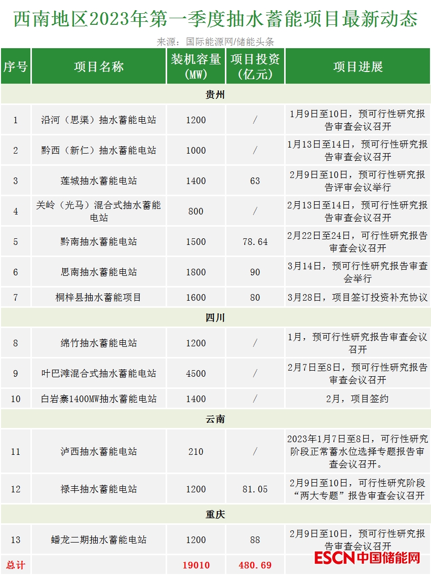 2023年一季度,西南地區(qū)有13個抽水蓄能電站更新了動態(tài),裝機總規(guī)模為19.01GW,項目總投資480.69億元。
