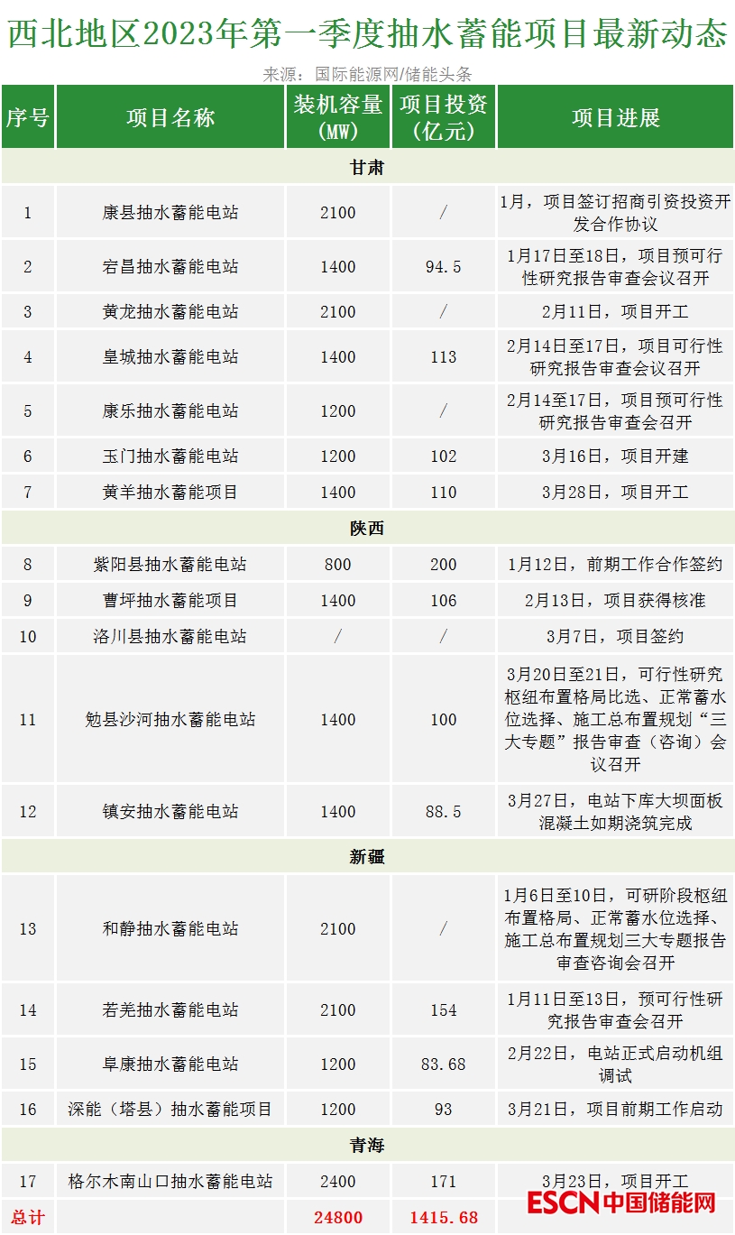 2023年一季度,西北地區(qū)有17個抽水蓄能電站更新了動態(tài),裝機總規(guī)模為24.8GW,項目總投資1415.68億元。