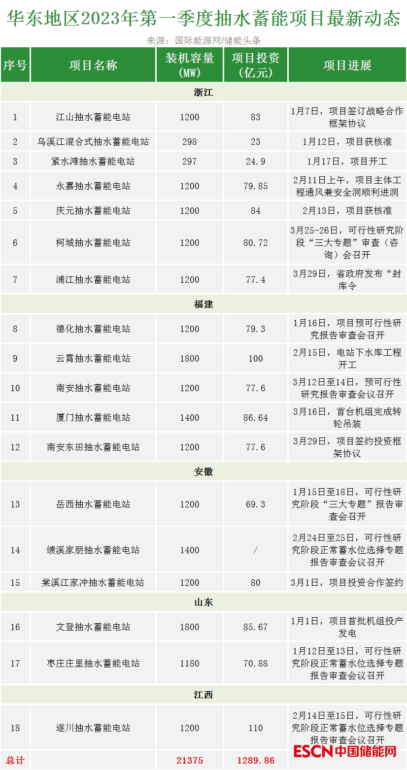 2023年一季度,華東地區(qū)有18個抽水蓄能電站更新了動態(tài),裝機總規(guī)模為21.4GW,項目總投資1289.86億元。