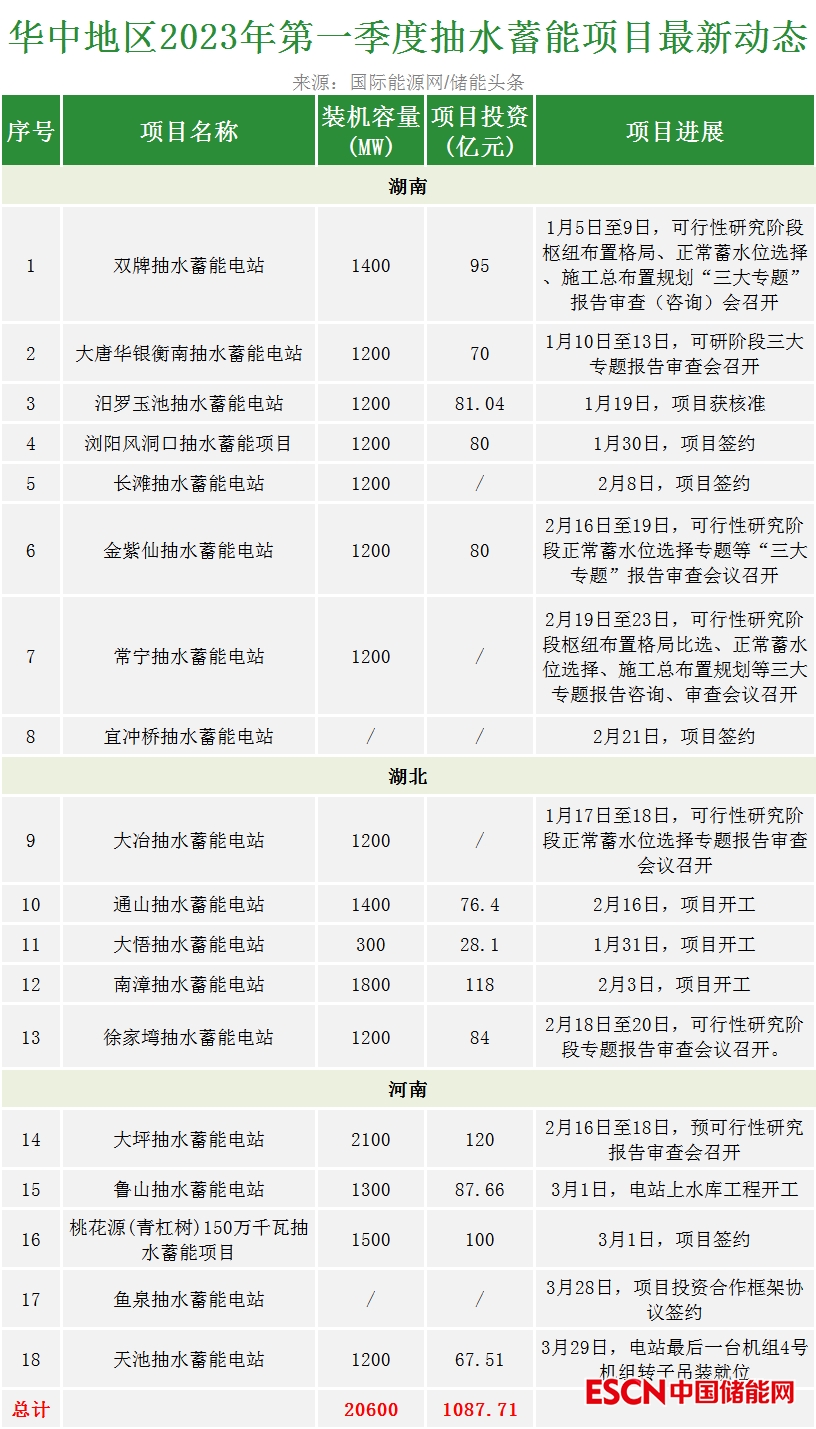 2023年一季度,華中地區(qū)有18個抽水蓄能電站更新了動態(tài),裝機總規(guī)模為20.6GW,項目總投資1087.71億元。