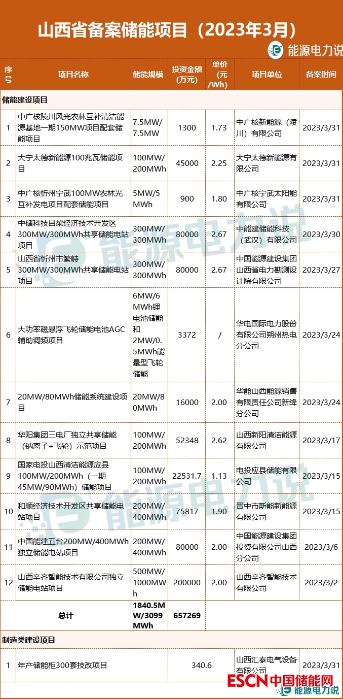 3月,山西省備案儲(chǔ)能項(xiàng)目13個(gè),其中儲(chǔ)能建設(shè)項(xiàng)目12個(gè),儲(chǔ)能產(chǎn)品制造類項(xiàng)目1個(gè),為山西匯泰電氣設(shè)備有限公司年產(chǎn)儲(chǔ)能柜300套技改項(xiàng)目。