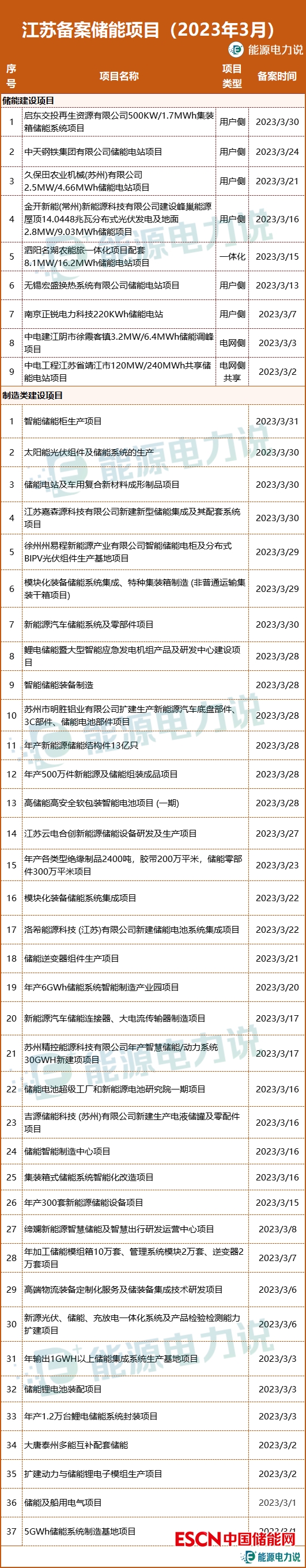 3月,江蘇省備案儲(chǔ)能項(xiàng)目46個(gè),其中儲(chǔ)能建設(shè)項(xiàng)目9個(gè),儲(chǔ)能產(chǎn)品制造類項(xiàng)目37個(gè)。