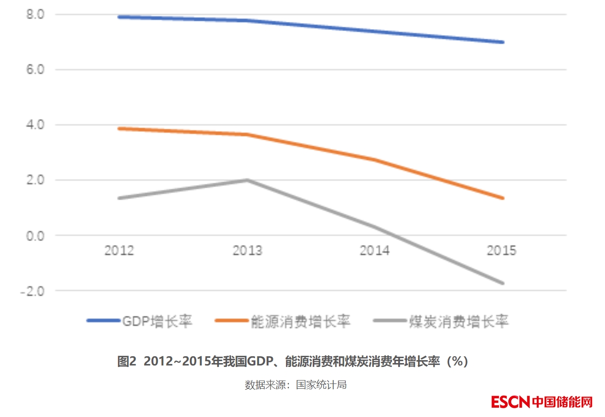 這個階段,我國經(jīng)濟正處于增長速度進入換擋期(GDP增速從超過10%回落到8%以內(nèi))、結(jié)構(gòu)調(diào)整面臨陣痛期(經(jīng)濟發(fā)展與資源環(huán)境的矛盾日趨尖銳,加快轉(zhuǎn)變經(jīng)濟發(fā)展方式和調(diào)整經(jīng)濟結(jié)構(gòu)刻不容緩)、前期刺激政策消化期(應(yīng)對2008年國際金融危機的刺激政策逐步退出,但政策的累積效應(yīng)和溢出效應(yīng)還在發(fā)揮作用,致使宏觀政策選擇與調(diào)控余地大為縮?。┑摹叭诏B加”階段。此時,經(jīng)濟發(fā)展對能源消費和煤炭消費需求增速明顯降低。圖2為2012~2015年我國GDP、能源消費和煤炭消費增速。
