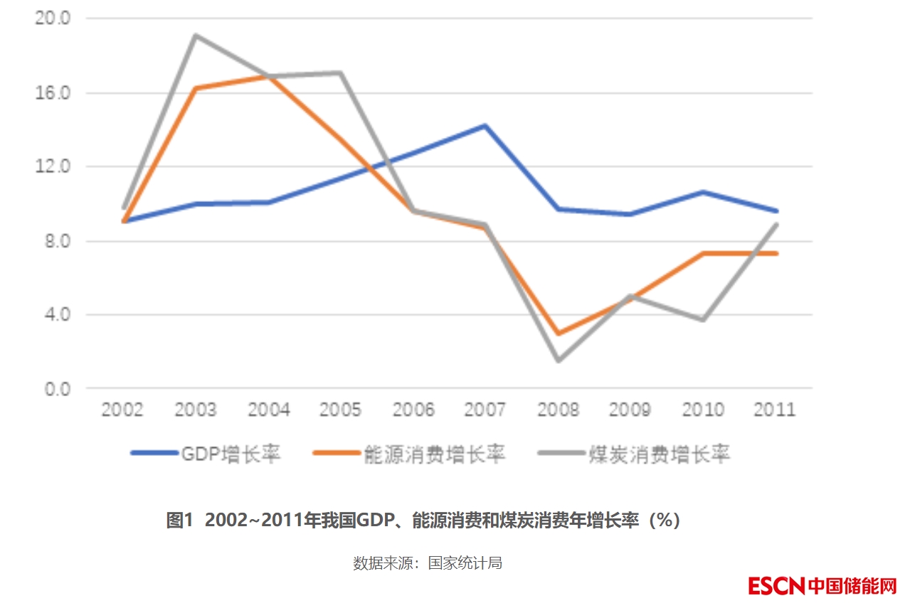 進入21世紀(jì),特別是加入世界貿(mào)易組織之后,我國經(jīng)濟進入快速增長通道。2003~2007年,我國GDP都保持兩位數(shù)增長。但是同期,我國的能源消費保持了更快的增長速度,暴露出我國經(jīng)濟發(fā)展嚴(yán)重依賴能源資源的問題,特別是煤炭消費特征明顯,環(huán)境污染問題逐漸顯現(xiàn)。2008年爆發(fā)的國際金融危機對我國經(jīng)濟增長產(chǎn)生不利影響,但是兩年新增4萬億元投資等一攬子行動計劃防止了經(jīng)濟過快下滑,保障了經(jīng)濟平穩(wěn)發(fā)展,同時,也加快了能源消費的觸底反彈。圖1為2002~2011年我國GDP、能源消費和煤炭消費增長情況。在2003~2011年之間(除2010年之外),我國煤炭在能源消費中的占比均超過70%,處于歷史高位階段。