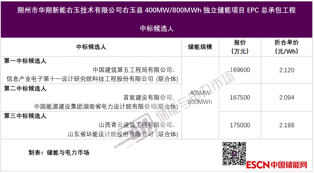 中國能源建設(shè)集團山西省電力勘測設(shè)計院有限公司以286656萬元,折合單價3.583元/Wh,中標朔州市華朔新能源技術(shù)有限公司右玉縣400MW/800MWh獨立儲能項目EPC總承包工程。