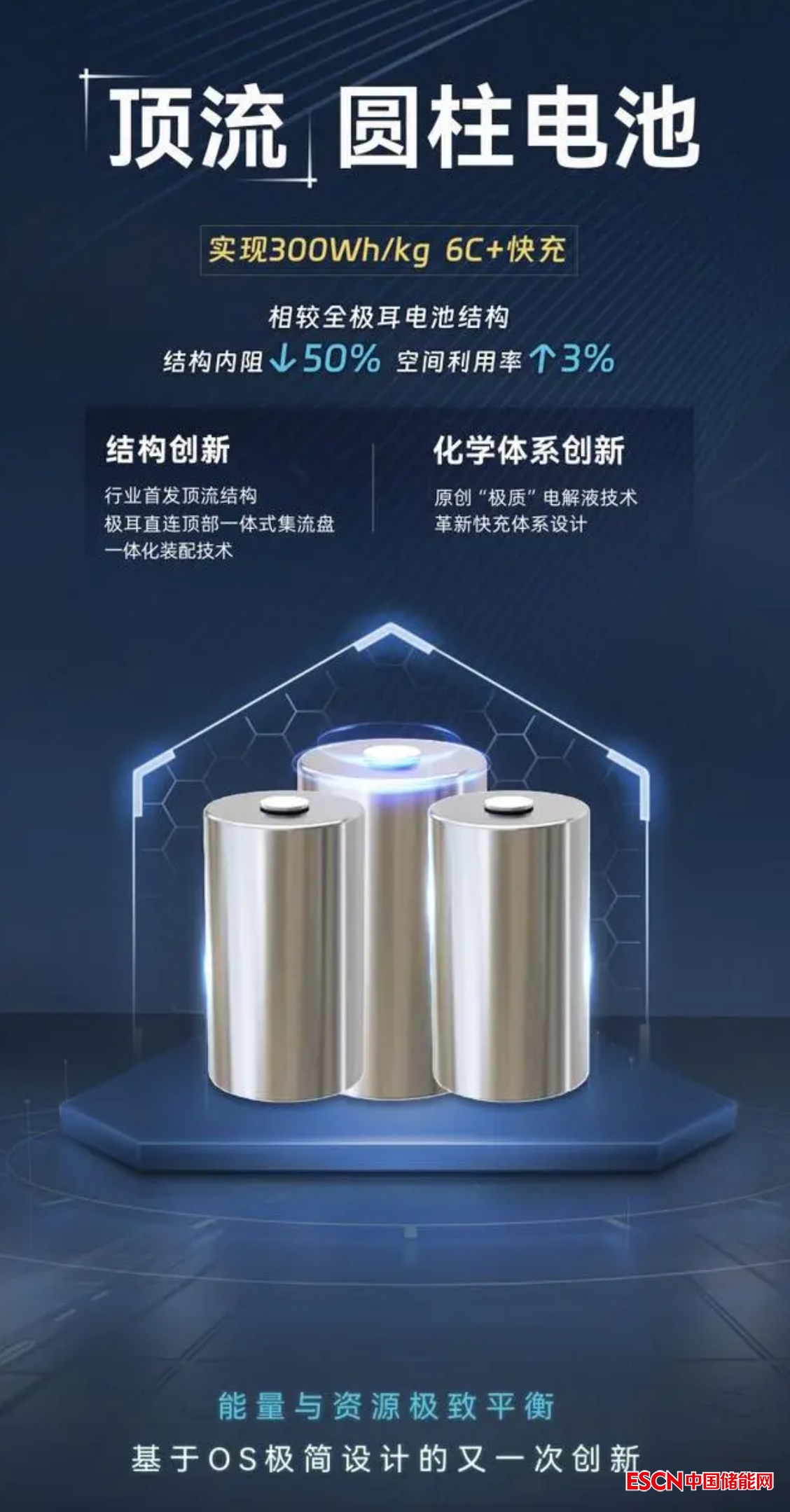 該公司稱,“頂流”圓柱電池是基于中創(chuàng)新航 One-Stop (OS) 極簡設(shè)計(jì)的又一次創(chuàng)新,通過自研結(jié)構(gòu)創(chuàng)新與化學(xué)體系創(chuàng)新研發(fā)而成。采用了行業(yè)首發(fā)頂流結(jié)構(gòu)與原創(chuàng)“極質(zhì)”電解液技術(shù),結(jié)構(gòu)內(nèi)阻相較于全極耳結(jié)構(gòu)下降 50%,能量密度可達(dá) 300Wh/kg,實(shí)現(xiàn) 6C + 快充,電池性能大幅提升。