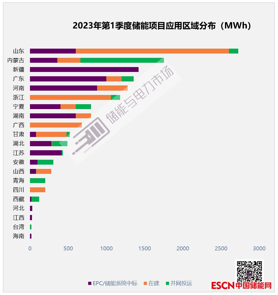 從區(qū)域分布上看,山東省2023年1季度進入實施階段的儲能項目裝機規(guī)模最大,超過2.7GWh。新疆擁有1.4GWh完成招投標的項目,這些項目預計將成為2023年下半年新增投運項目的主要力量之一。