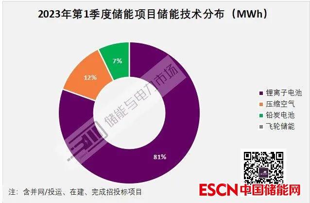 鋰離子電池仍舊是新型儲能中最主要的應用技術(shù),2023年1季度,81%的裝機占比由鋰離子電池貢獻。