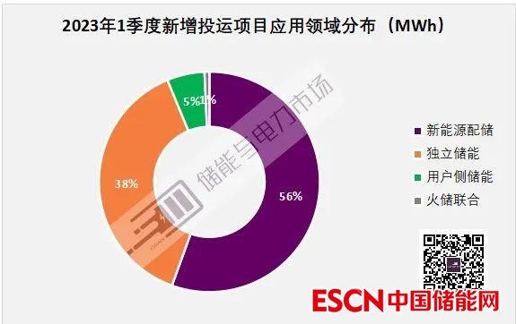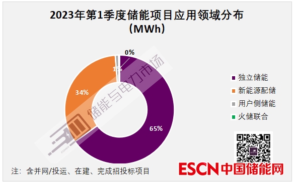 從應用領域上看,2023年1季度進入實施階段的儲能項目中,獨立式儲能電站占比最大,MWh占比65%。