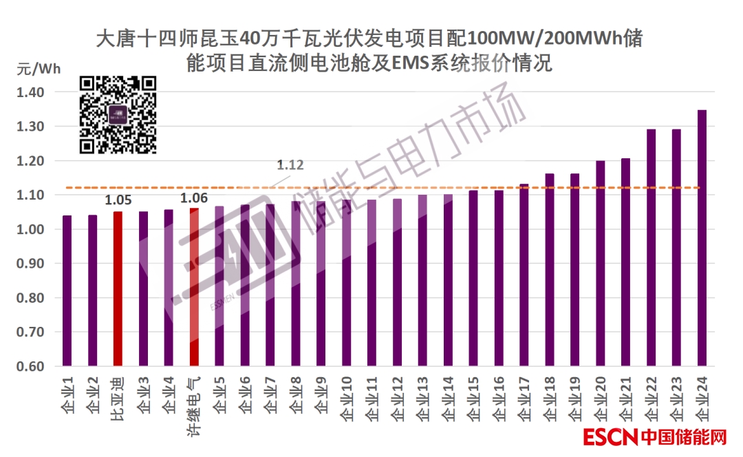 據(jù)悉,此次招標吸引了近30家企業(yè)參與競爭。報價區(qū)間1.04-1.35元/Wh。平均報價1.12元/Wh。此次預中標價格1.05元/Wh又創(chuàng)新低。相較于3月開標的單直流側1.18元/Wh,下降11%。(3月直流側開標情況可參考文章:1.18-1.483元/Wh,龍源電力1.2GWh直流側集采開標,央企儲能集采分段招標或將成趨勢)。