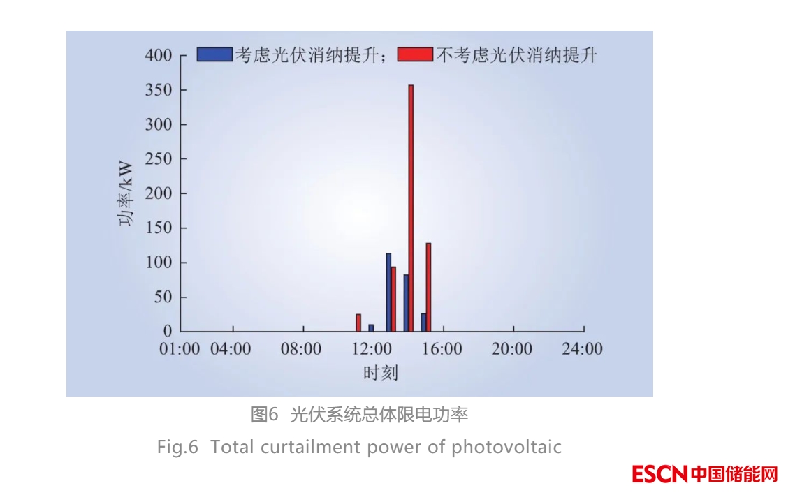 2種目標下光伏限電功率如圖6所示。當儲能考慮光伏消納提升時,光伏日限電量僅為231.7 kW·h,此時儲能日收益為376.2元。當儲能不考慮光伏消納提升時,光伏日限電量為603.4 kW·h,此時儲能日收益為475.9元。儲能不考慮光伏消納提升時,儲能收益提高了26.5%,但是限電量增加了160.4%,其社會總效益仍呈現(xiàn)了大幅降低趨勢。采用提出的儲能優(yōu)化控制模型和方法,能夠實現(xiàn)光伏和儲能系統(tǒng)的綜合效益提升,并且降低大規(guī)模電網(wǎng)的求解難度。