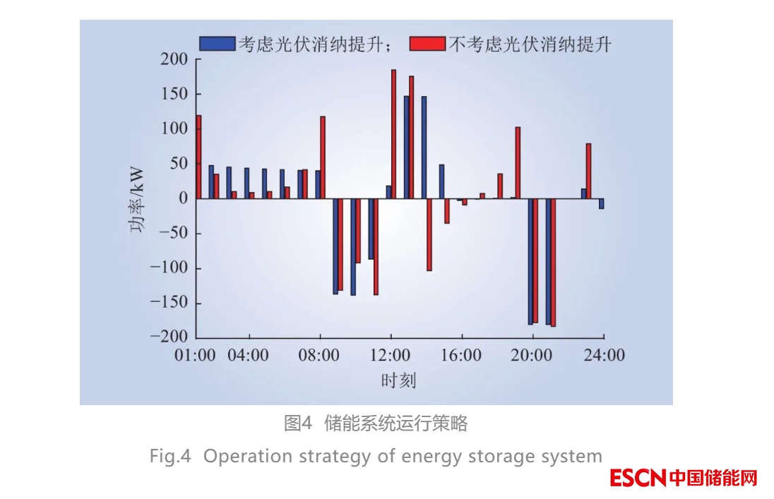 考慮與不考慮光伏消納提升的儲能系統(tǒng)運行策略如圖4所示。從圖4中可以看出,儲能運行策略在中午光伏出力高峰時段差異性較大。考慮光伏消納提升時,其優(yōu)化運行策略完全符合實際功率下限約束,說明了實際功率下限計算的合理性。不考慮光伏消納提升的儲能系統(tǒng)充、放電特性僅與電價峰谷特性緊密相關,與光伏出力特性并無關聯(lián)。