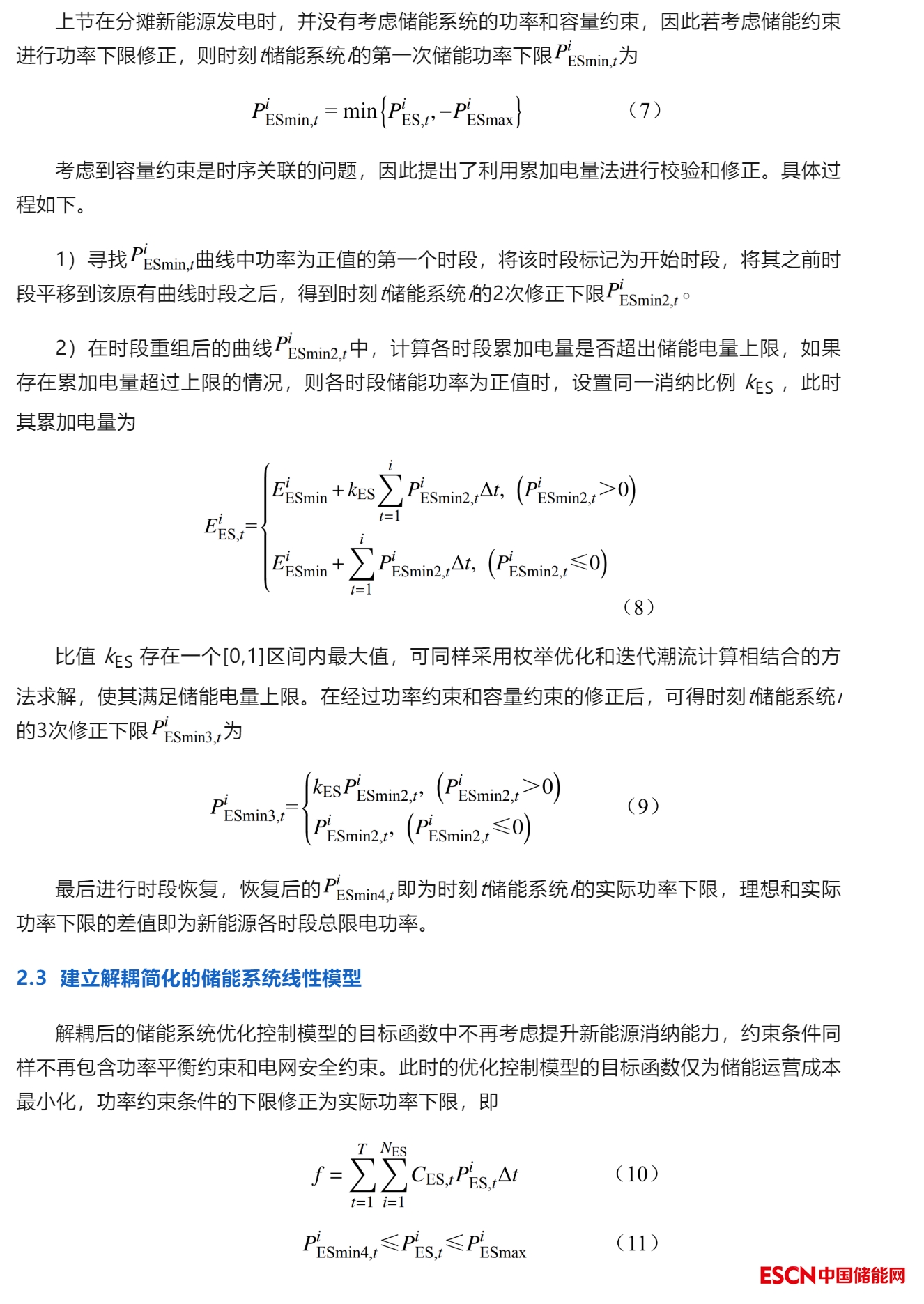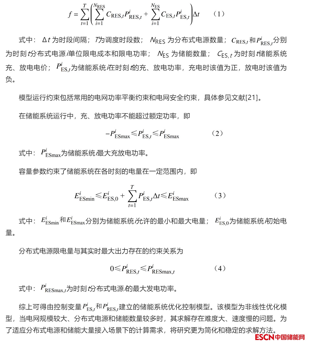 摘要:在中國提升新能源消納能力、助力碳達峰碳中和目標實現(xiàn)的背景下,提出了一種基于解耦的儲能參與新能源消納的優(yōu)化控制方法。針對儲能系統(tǒng)優(yōu)化控制非線性模型求解難題,提出了基于解耦的線性簡化方法,利用枚舉優(yōu)化和迭代潮流計算結合方法,建立了滿足提升新能源消納目標和電網(wǎng)安全運行約束的儲能運行緊致約束條件。算例測試顯示,基于解耦的線性簡化模型與原有非線性模型保持一致,降低了高階優(yōu)化控制模型的求解難度,保障了儲能提升新能源消納的快速可靠決策,提升了新能源和儲能綜合運行效益。