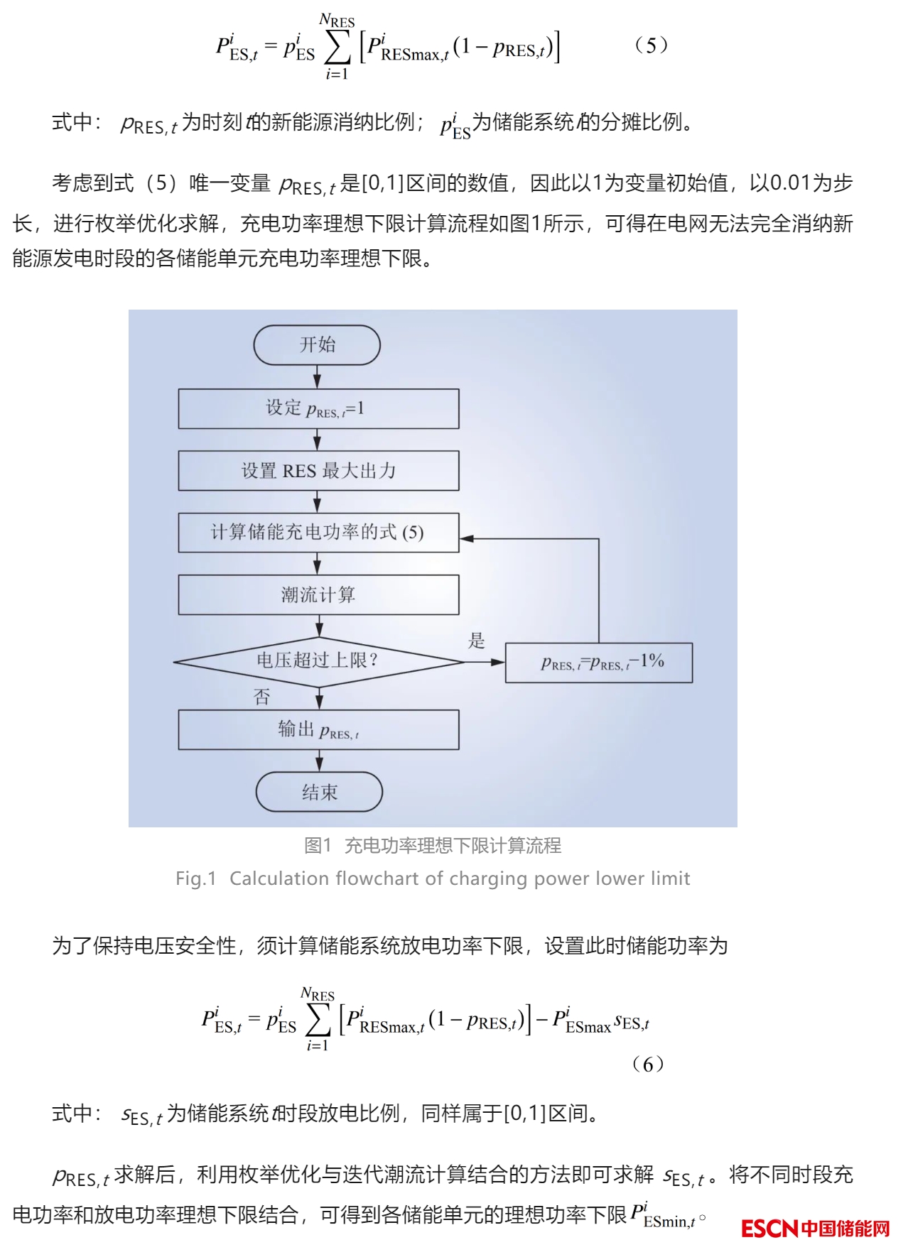 在大規(guī)模新能源并網(wǎng)場景下,特別是在配電網(wǎng)中,制約新能源消納的原因主要為負荷較小無法實現(xiàn)就地消納時,反向潮流造成局部電壓升高[22-24],從而降低了電網(wǎng)運行安全性。因此儲能運行控制模型須考慮電網(wǎng)安全性約束,并適應新能源和儲能快速發(fā)展需求,進一步提出適應大規(guī)模非線性優(yōu)化問題的快速穩(wěn)定的求解方法。在此背景下,本文提出了一種基于解耦的儲能參與新能源消納的優(yōu)化控制方法。該方法建立了提升新能源消納的儲能系統(tǒng)優(yōu)化控制模型。針對該非線性優(yōu)化模型的求解難題,提出了基于枚舉優(yōu)化和迭代潮流計算解耦的儲能系統(tǒng)功率的理想下限計算方法,保障了系統(tǒng)電壓運行安全約束。根據(jù)儲能系統(tǒng)的容量和功率約束進一步修正功率下限。在滿足修正后的功率約束條件下,建立解耦簡化后的儲能系統(tǒng)優(yōu)化控制的線性規(guī)劃模型,進而計算儲能優(yōu)化運行策略。