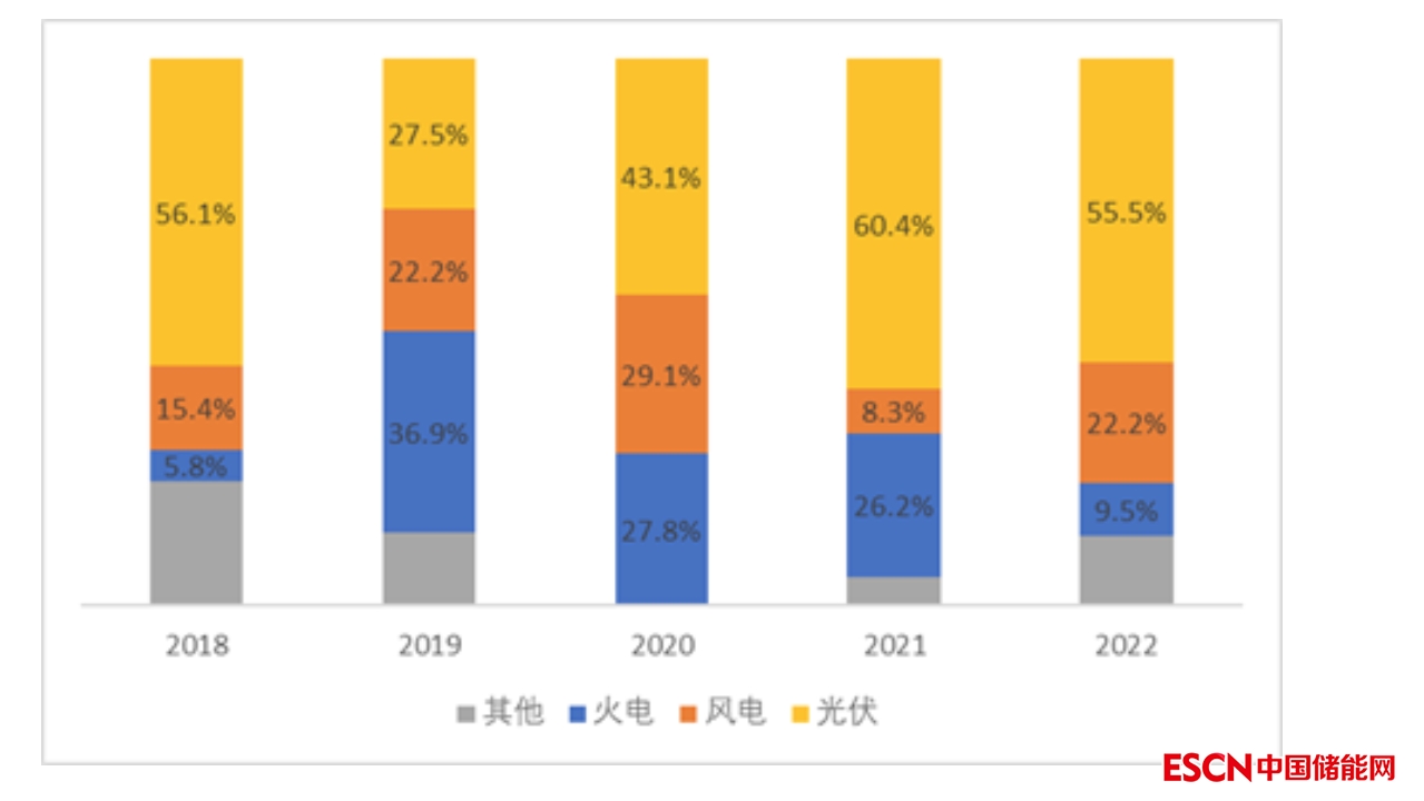 以上述現(xiàn)貨試點省份為例。該省近年來新能源裝機(jī)增長勢頭迅猛,近5年新增裝機(jī)中新能源裝機(jī)占比近70%,其中光伏占比近50%。