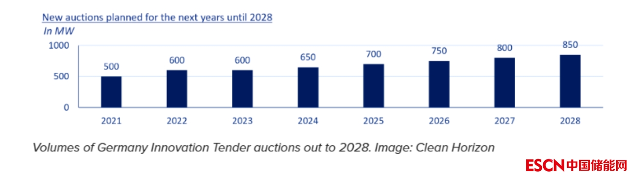 德國(guó)聯(lián)邦網(wǎng)絡(luò)局(Bundesnetzagentur)在2021年推出了創(chuàng)新招標(biāo),為新能源開發(fā)商提供并網(wǎng)能源的固定溢價(jià),為期20年,以鼓勵(lì)可再生能源加儲(chǔ)能在全國(guó)的部署。這種招標(biāo)將每年進(jìn)行一次,預(yù)計(jì)到2028年將采購(gòu)5450MW的總?cè)萘俊?