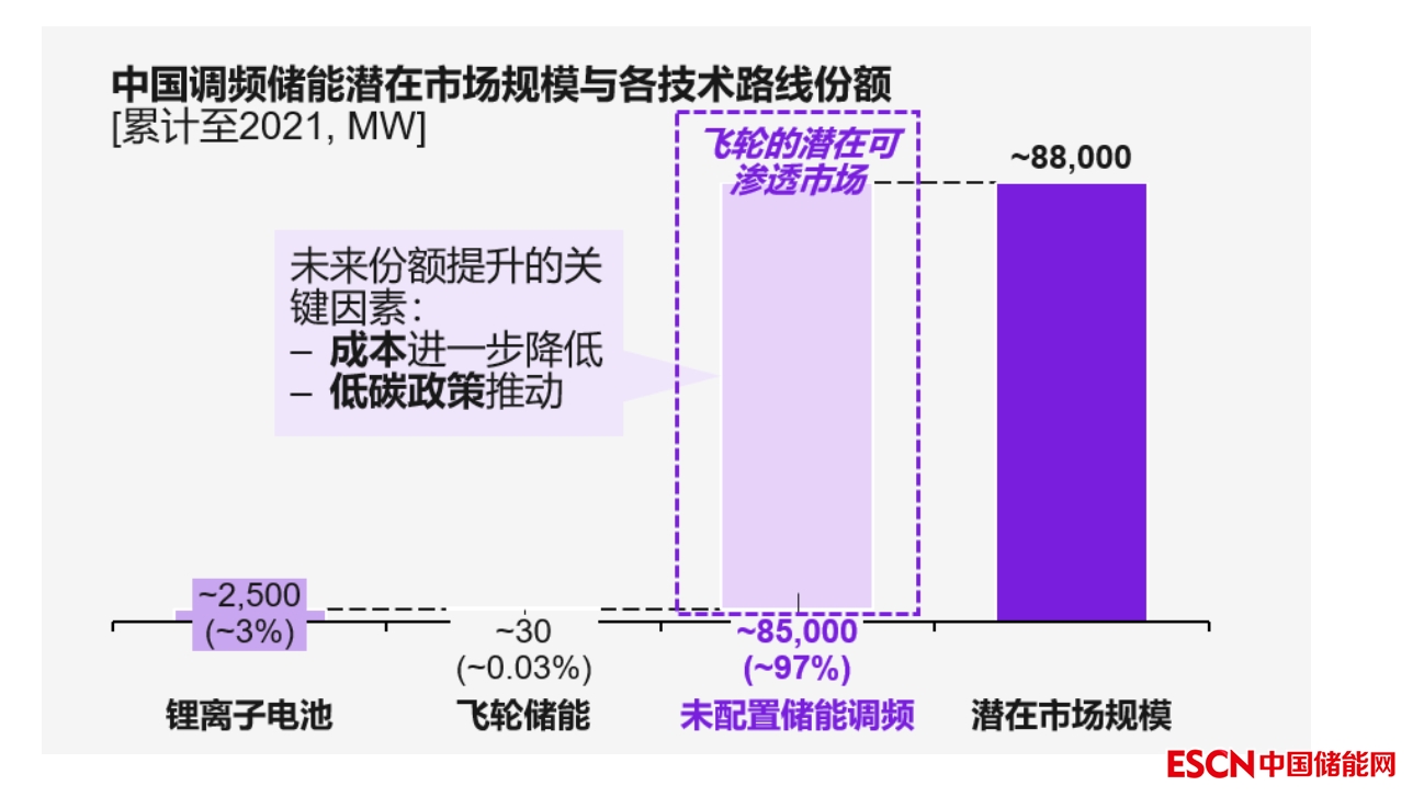 科爾尼認為,飛輪應(yīng)用于電網(wǎng)調(diào)頻屬于高潛力的藍海市場。隨著技術(shù)提升,2022年以來,飛輪在電網(wǎng)調(diào)頻應(yīng)用領(lǐng)域的有效成本已經(jīng)與鋰電池逐步接近,未來的市場競爭格局有望發(fā)生變化??茽柲犷A(yù)測,飛輪在中國電網(wǎng)調(diào)頻領(lǐng)域的潛在市場規(guī)模高達85,000MW(如圖7) 。