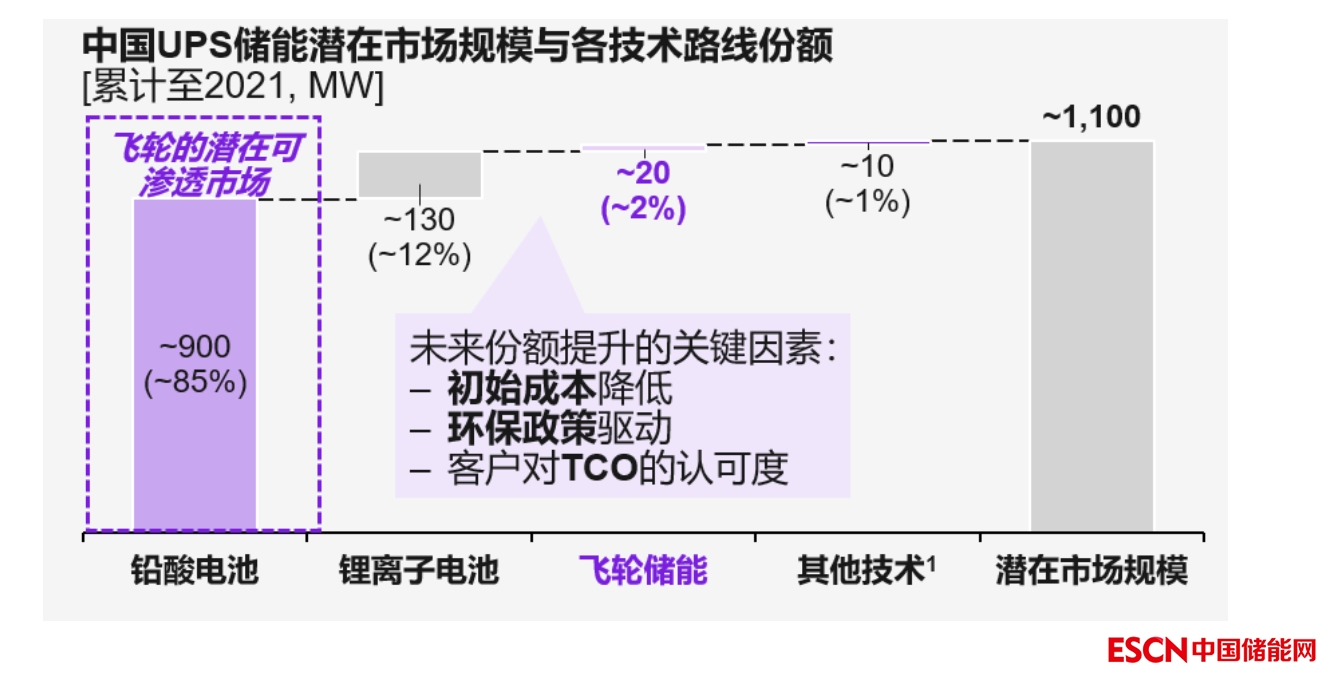 UPS不間斷電源屬于非剛需的政策引導(dǎo)型市場。根據(jù)飛輪儲能在高端醫(yī)療、高端制造業(yè)、大型數(shù)據(jù)中心和電源車四個應(yīng)用場景的潛力預(yù)判,預(yù)計飛輪在UPS不間斷電源的潛在市場規(guī)模可達約900MW,而目前的市場份額僅為2%(如圖 6)。飛輪在該場景下市場份額提升的關(guān)鍵因素包含初始成本的降低、客戶對TCO的認可度的提升、以及最重要的環(huán)保政策驅(qū)動。