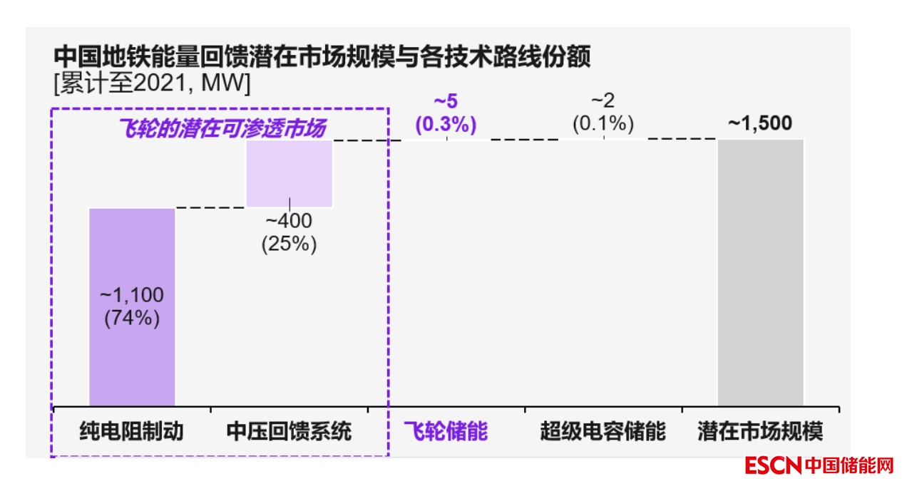 地鐵能量回饋屬于趨勢向好的培育型市場,盡管目前飛輪儲能在中國地鐵能量回饋場景的累計裝機規(guī)模僅為5MW,但其潛在市場規(guī)模(裝機量)可超過1500MW(如圖5)。飛輪在該場景中提升滲透率存在三大抓手:其一,初始成本下降、投資回報周期縮短;第二,市場對全生命周期成本的認可度提升;第三,重大事故防范能力提升。