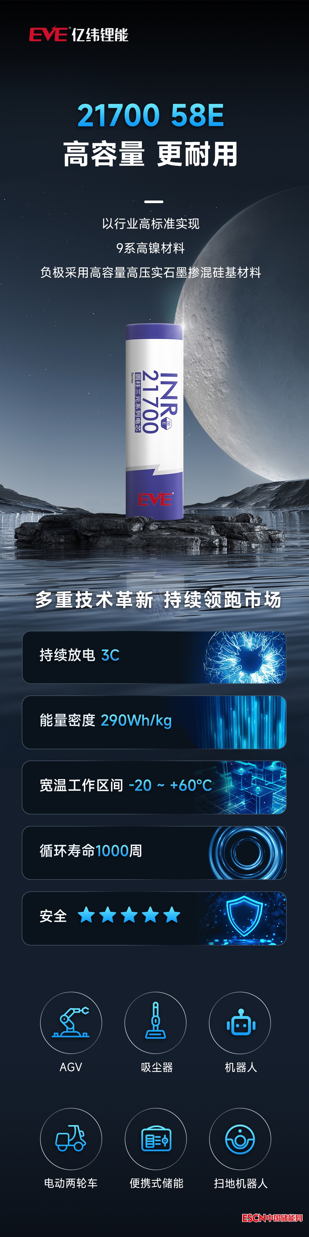 領(lǐng)先發(fā)布的21700 58E高容量產(chǎn)品,采用9系高鎳材料、負(fù)極采用高容量高壓實(shí)石墨摻混硅基材料,能量密度高達(dá)290Wh/kg,滿足產(chǎn)品長續(xù)航要求,匹配電動兩輪車、AGV、便攜式儲能、掃地機(jī)器人等多元應(yīng)用場景。
