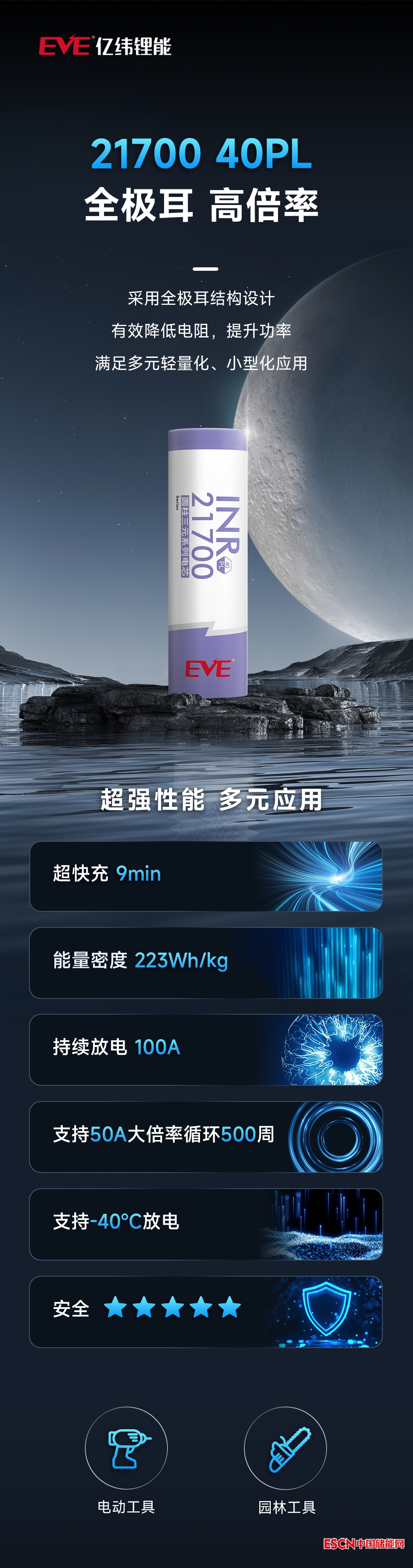 億緯鋰能圓柱電池解決方案具備特有的經(jīng)濟(jì)性與本征安全性、極致的標(biāo)準(zhǔn)化和可靠性優(yōu)勢,產(chǎn)品廣泛應(yīng)用于電動工具、園林工具、吸塵器、電動兩輪車、便攜式儲能等領(lǐng)域。億緯鋰能面向全球首次發(fā)布全極耳21700 40PL及高容量21700 58E兩款全新產(chǎn)品,滿足不同應(yīng)用場景的性能要求。