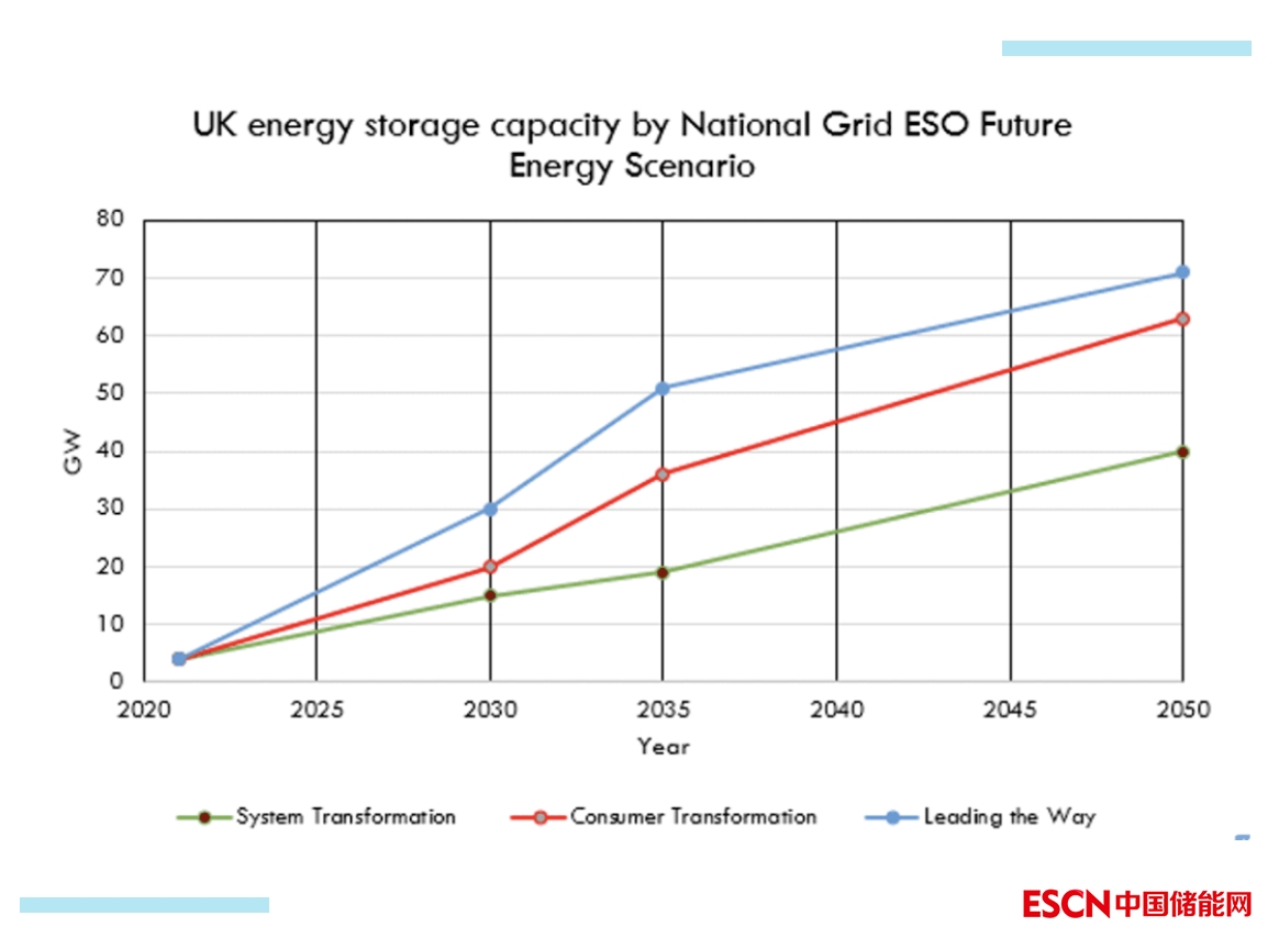 因此,英國(guó)需要在未來(lái)二十年內(nèi)迅速擴(kuò)大和部署儲(chǔ)能裝機(jī),以替代天然氣目前的作用,才能實(shí)現(xiàn)零排放。英國(guó)目前的儲(chǔ)能容量?jī)H為2.4吉瓦左右,但電力系統(tǒng)運(yùn)營(yíng)商國(guó)家電網(wǎng)ESO根據(jù)其未來(lái)能源需求情景估計(jì),到2030年儲(chǔ)能裝機(jī)至少需要達(dá)到15吉瓦,到2050年至少需要40吉瓦,才能實(shí)現(xiàn)2050年的凈零排放目標(biāo)。