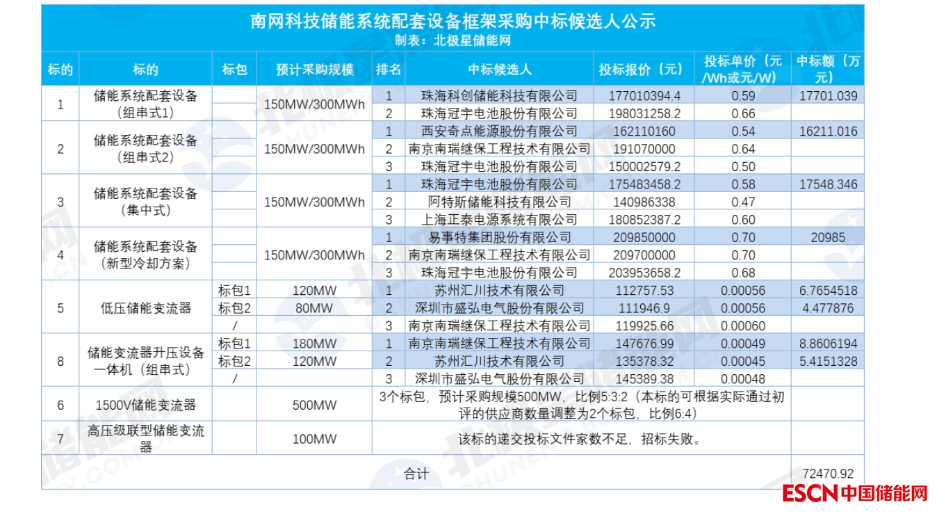 中國儲能網(wǎng)訊:4月14日,南方電網(wǎng)電力科技股份有限公司的儲能系統(tǒng)配套設備框架采購中標候選人公示。共有9家企業(yè)入圍中標候選人名單,七家企業(yè)預中標,中標總額約7.25億元!