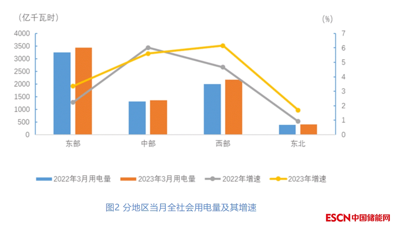 3月份,東、中、西部和東北地區(qū)全社會(huì)用電量增速分別為5.7%、4.3%、7.4%和5.4%。