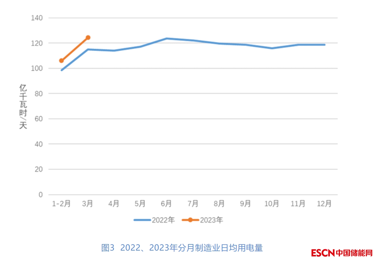 3月份,全國(guó)制造業(yè)用電量3855億千瓦時(shí),同比增長(zhǎng)7.4%;制造業(yè)日均用電量124.4億千瓦時(shí)/天,比上年同期增加9.5億千瓦時(shí)/天,比上月增加5.3億千瓦時(shí)/天。其中,四大高載能行業(yè)用電量合計(jì)2070億千瓦時(shí),同比增長(zhǎng)6.1%;高技術(shù)及裝備制造業(yè)用電量842億千瓦時(shí),同比增長(zhǎng)10.8%;消費(fèi)品制造業(yè)用電量500億千瓦時(shí),同比增長(zhǎng)5.0%;其他制造業(yè)行業(yè)用電量443億千瓦時(shí),同比增長(zhǎng)9.4%。