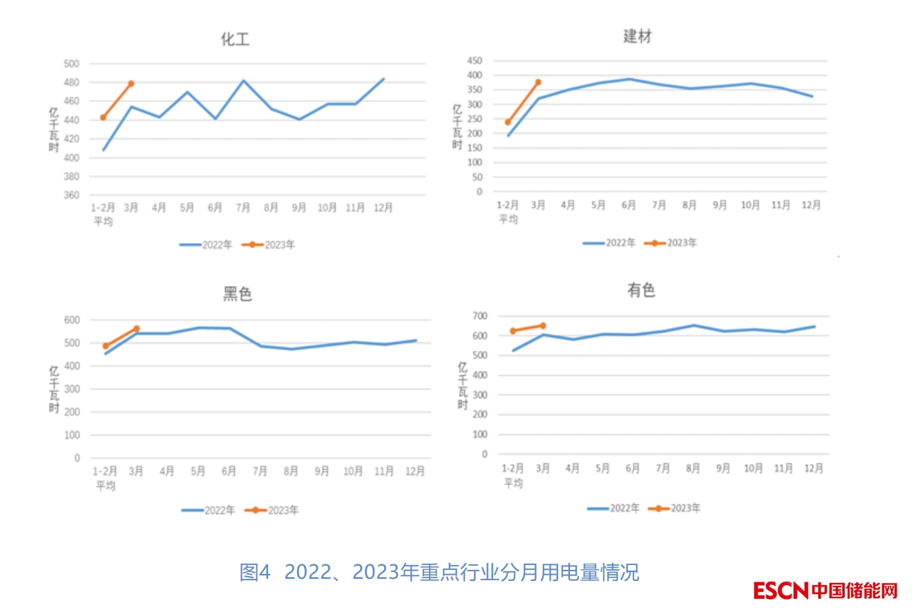 1-3月,化工行業(yè)用電量1365億千瓦時(shí),同比增長(zhǎng)1.7%;建材行業(yè)用電量856億千瓦時(shí),同比增長(zhǎng)7.5%;黑色金屬冶煉行業(yè)用電量1534億千瓦時(shí),同比增長(zhǎng)2.7%;有色金屬冶煉行業(yè)用電量1902億千瓦時(shí),同比增長(zhǎng)5.9%。