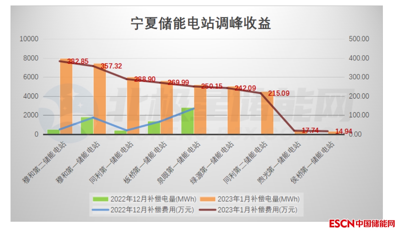據(jù)北極星儲能網(wǎng)統(tǒng)計(jì),自2022年12月開始,寧夏投運(yùn)的儲能電站陸續(xù)開始參與西北地區(qū)電力輔助服務(wù)調(diào)峰市場,2022年12月-2023年1月兩個月內(nèi)9座儲能電站累計(jì)調(diào)峰收益超過2370萬元。