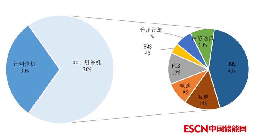 三是關(guān)鍵產(chǎn)品質(zhì)量有待加強。雖然2022年電化學(xué)儲能平均轉(zhuǎn)換效率為81.06%,但是各地、各企業(yè)間差距較大,最高為92.51%,最低為33.91%,從投運時間段來看,投產(chǎn)1年內(nèi)的平均轉(zhuǎn)換效率為80.53%,5年以上的平均轉(zhuǎn)換效率為60.86%,反映出電池產(chǎn)品整體質(zhì)量還不十分成熟穩(wěn)定。2022年,全年非計劃停運671次,單位能量非計劃停運次數(shù)為24.45次/100MWh,相比2022年火電機組的非計劃停運次數(shù)0.35次/(臺?年),差距較大。電池管理系統(tǒng)(BMS)異常是電化學(xué)儲能電站非計劃停運的主要原因,停運次數(shù)占比43%,儲能變流器(PCS)、電池等電站關(guān)鍵設(shè)備異常導(dǎo)致的非計劃停運,單次平均停運時長最長,分別為60.98h、55.74h。