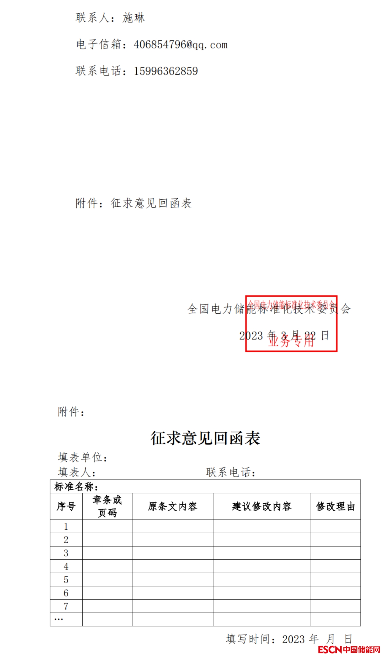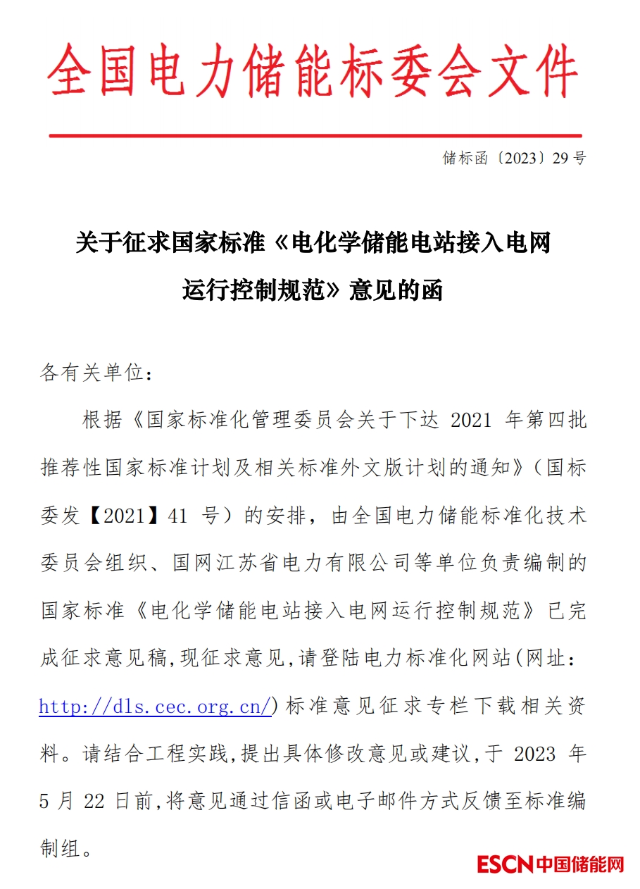 關(guān)于征求國家標準《 電化學儲能電站接入電網(wǎng)運行控制規(guī)范》意見的函