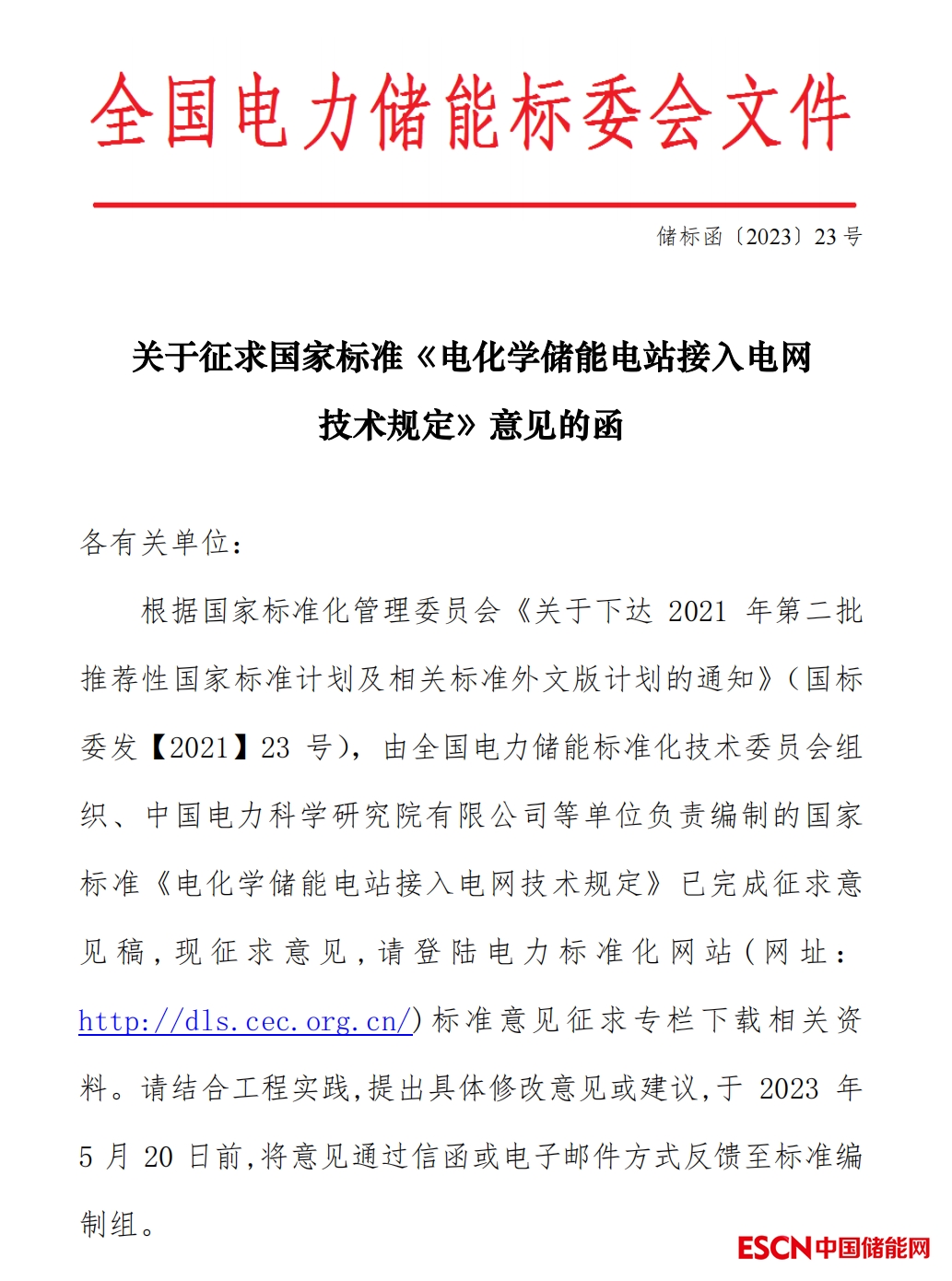 關(guān)于征求國家標(biāo)準(zhǔn)《 電化學(xué)儲(chǔ)能電站接入電網(wǎng)技術(shù)規(guī)定》意見的函