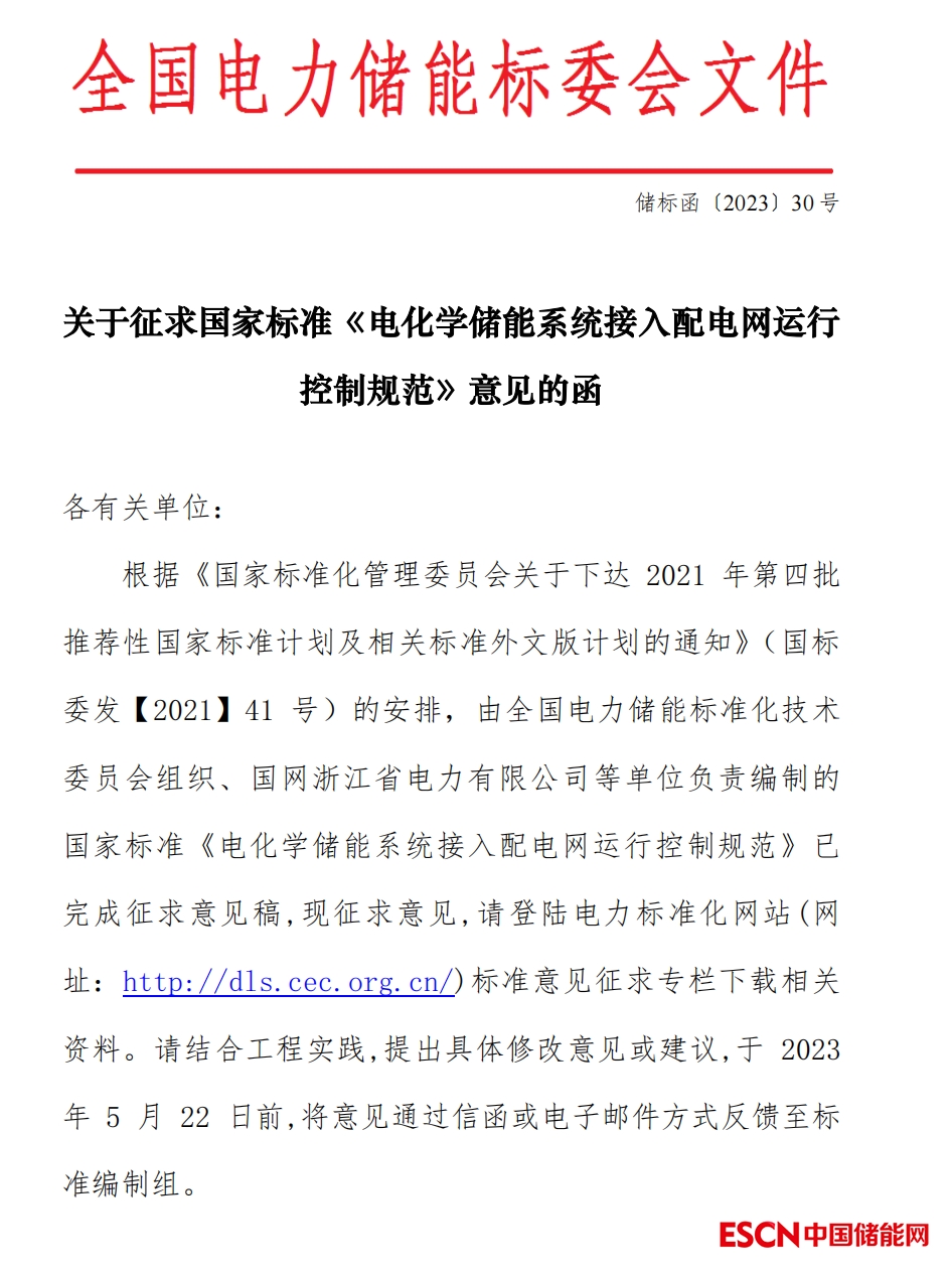 關(guān)于征求國(guó)家標(biāo)準(zhǔn)《 電化學(xué)儲(chǔ)能系統(tǒng)接入配電網(wǎng)運(yùn)行控制規(guī)范》意見(jiàn)的函