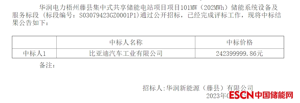 公告顯示,中標(biāo)人為比亞迪汽車工業(yè)有限公司,中投標(biāo)價(jià)格242399999.86元,折合單價(jià)約為1.2元/Wh。