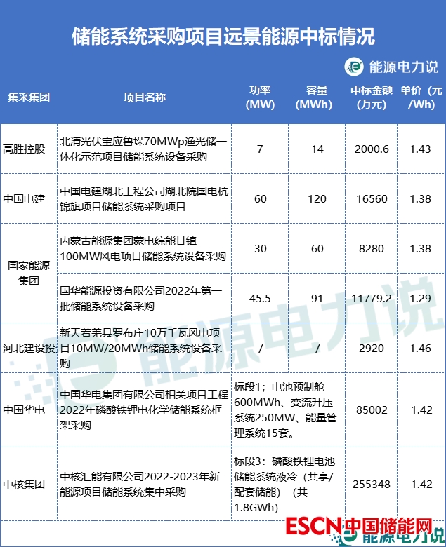 遠(yuǎn)景能源中標(biāo)了高勝控股、電建、國家能源、華電、中核集團7個儲能系統(tǒng)采購項目,報價在1.29-1.43元/Wh。