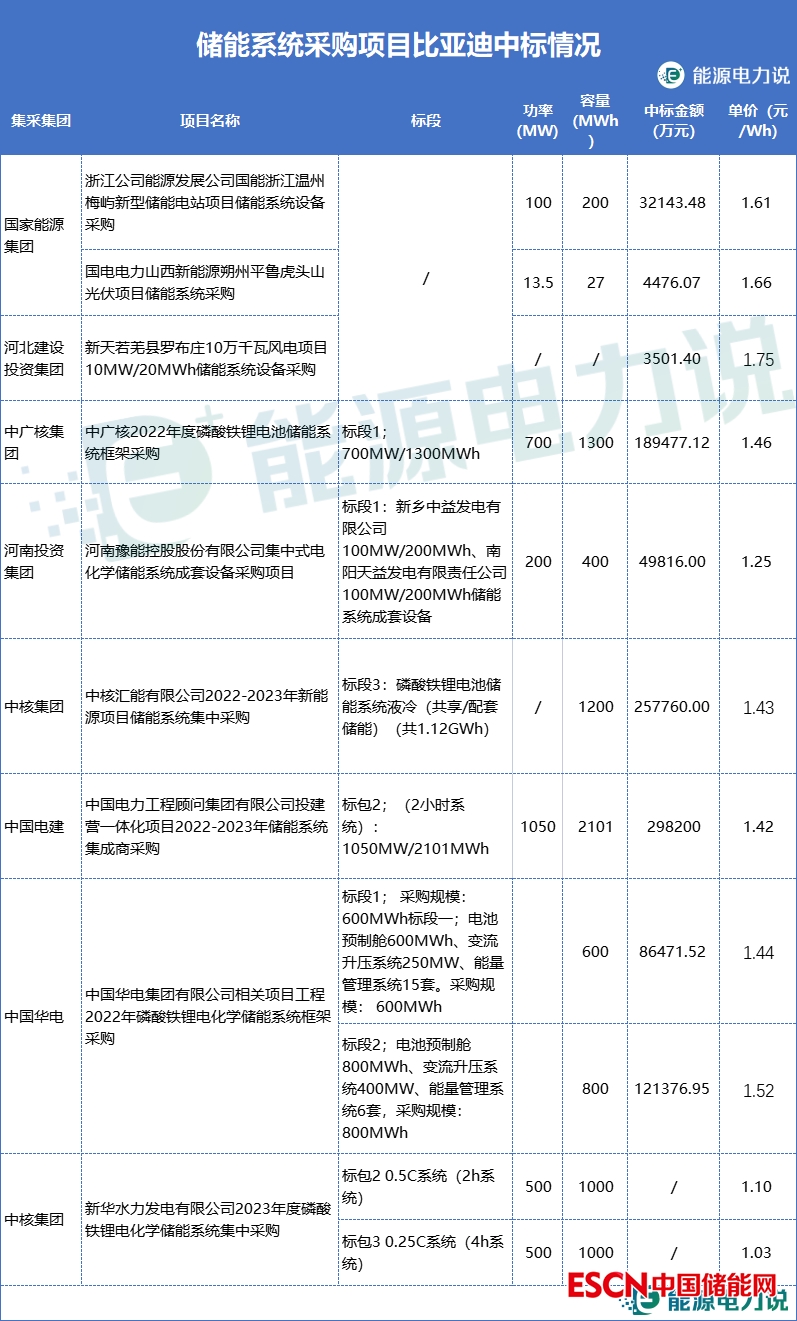比亞迪在中國電建、國家能源集團、中核集團等多個集團的儲能系統(tǒng)采購項目中成功中標(biāo)。其中包括斬獲中廣核2022年度磷酸鐵鋰電池儲能系統(tǒng)集采標(biāo)段一700MW/1300MWh訂單。這些儲能系統(tǒng)項目中標(biāo)單價在1.03-1.75元/Wh之間,在新華水發(fā)電2023年度磷酸鐵鋰電化學(xué)儲能系統(tǒng)集采中分別入圍2h、4h系統(tǒng)標(biāo)段,中標(biāo)報價分別為1.10元/Wh、1.03元/Wh。