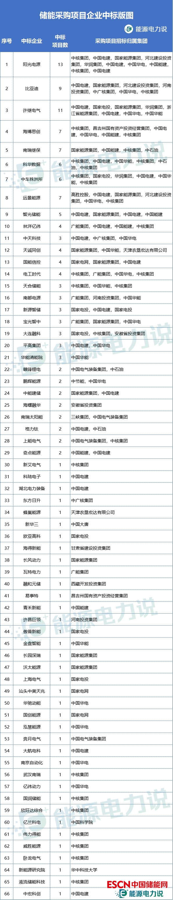在統(tǒng)計的在各大集團單位117個儲能系統(tǒng)采購項目中,共66家企業(yè)中標(biāo),包括比亞迪、海博思創(chuàng)、遠(yuǎn)景能源、科華數(shù)據(jù)、許繼電氣、智光電氣、南瑞繼保、中車株洲所、山東電工時代、林洋億偉、中天科技、天誠同創(chuàng)和天津瑞源電氣等。
