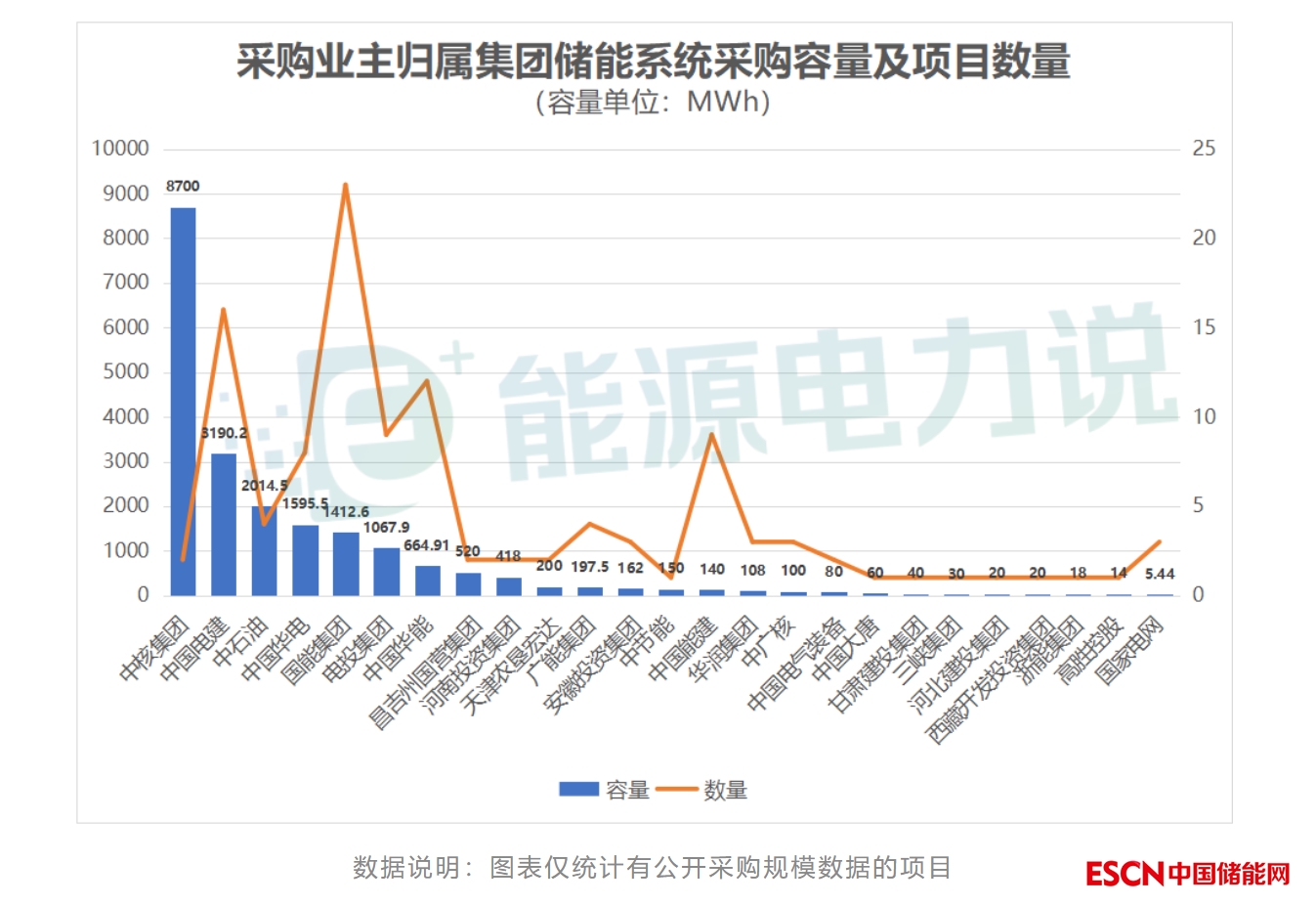 采購業(yè)主以央國企及其下屬單位為主,從采購容量規(guī)模來看,中核集團、中國電建、中石油、中國華能、國家能源集團、電投集團均完成了GWh級的儲能系統(tǒng)集采。