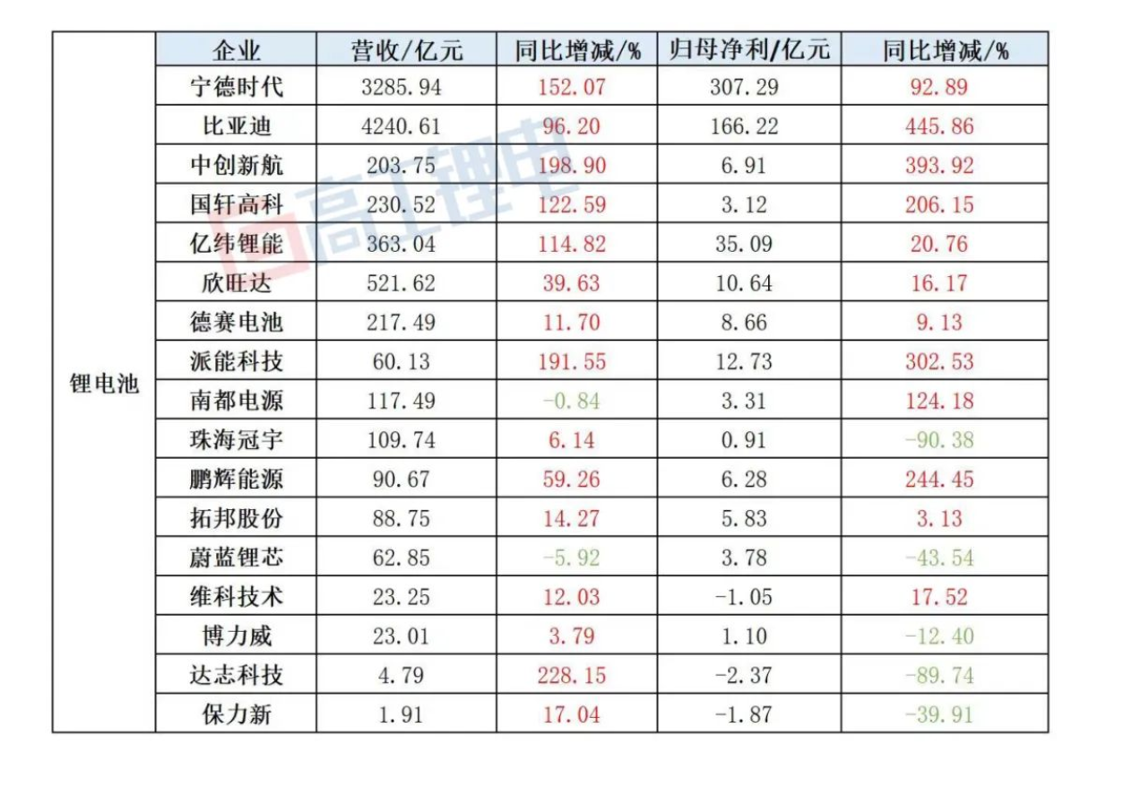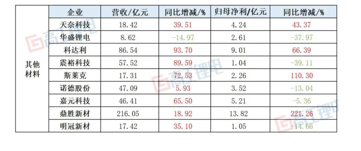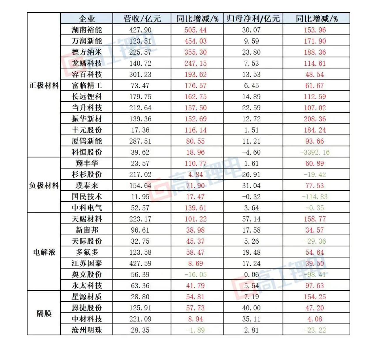 正極材料方面,磷酸鐵鋰正極材料企業(yè)業(yè)績(jī)表現(xiàn)最為突出。湖南裕能、萬潤(rùn)新能、德方納米、龍?bào)纯萍肌⒏慌R精工等均實(shí)現(xiàn)營(yíng)收增長(zhǎng)超170%,歸母凈利潤(rùn)也普遍翻倍。
