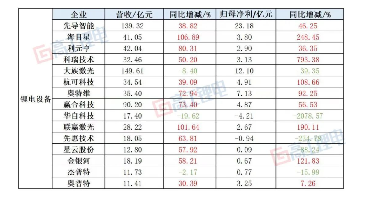 鋰電設(shè)備龍頭企業(yè)先導(dǎo)智能實(shí)現(xiàn)營(yíng)收、歸母凈利潤(rùn)139.3億元、23.2億元,均同比增長(zhǎng)超30%。