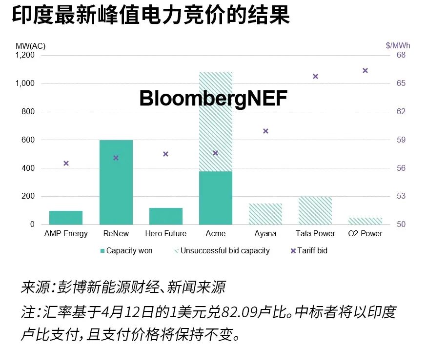 Solar Energy Corp. of India在4月12日對1.2GW的風光儲一體化項目進行競價。它是負責進行印度清潔電力招標的聯(lián)邦機構。四家獨立發(fā)電商(IPP)已被宣布中標——AMP Energy(100MW)、ReNew(600MW)、Hero Future Energies(120MW)和Acme Cleantech Solutions(380MW)。這是印度最新的復雜電力競價,需要綜合多種技術才能滿足特定的可再生能源供電條件。