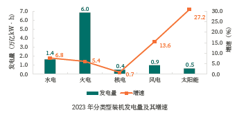 全國發(fā)電量穩(wěn)步增長,火電發(fā)電量比重持續(xù)下降。2023年,預(yù)計(jì)全國發(fā)電量為9.3萬億千瓦時(shí),比上年增長7.2%。其中,水電、火電、核電、風(fēng)電、太陽能發(fā)電量占比分別為15.5%、64.8%、4.5%、9.3%、5.8%,較上年分別變化-0.1、-1.1、-0.3、0.5、0.9個(gè)百分點(diǎn),對發(fā)電增長的貢獻(xiàn)率分別為14.8%、49.3%、0.5%、16.7%、18.7%。預(yù)計(jì)全國發(fā)電設(shè)備平均利用小時(shí)數(shù)為3651小時(shí),比上年下降約37小時(shí),其中,水電、火電利用小時(shí)數(shù)比上年分別上升138、55小時(shí),核電、風(fēng)電、太陽能利用小時(shí)數(shù)比上年分別減少約66、11、27小時(shí)。