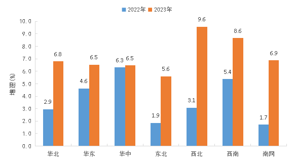 華北、華東、南方電網(wǎng)區(qū)域是用電增長主要拉動(dòng)區(qū)域。2023年,預(yù)計(jì)華北(含蒙西)、華東、華中、東北、西北、西南、南方電網(wǎng)區(qū)域全社會(huì)用電量比上年分別增長6.8%、6.5%、6.5%、5.6%、9.6%、8.6%、6.9%,西北電網(wǎng)區(qū)域用電增速最高,各區(qū)域用電增速均較上年不同程度反彈。預(yù)計(jì)華北(含蒙西)、華東、南方電網(wǎng)區(qū)域是拉動(dòng)用電增長的主要區(qū)域,合計(jì)貢獻(xiàn)率超過60%。