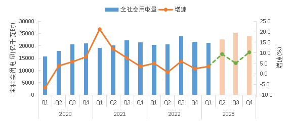 分季度看,預(yù)計(jì)2023年各季度全國全社會(huì)用電量增速分別為3.6%、9.4%、5.1%、10.3%,受上年基數(shù)影響,第二、四季度用電增速顯著高于第一、三季度用電增速。