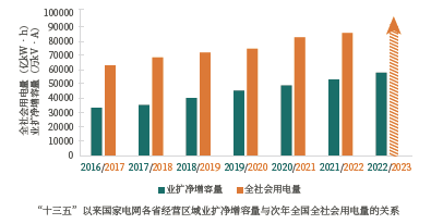 業(yè)擴(kuò)凈增容量較快增長,為用電增長提供有力支撐。2022年,國家電網(wǎng)公司經(jīng)營區(qū)域累計(jì)完成業(yè)擴(kuò)凈增容量5.8億千伏安,比上年增長9.1%。根據(jù)歷年業(yè)擴(kuò)凈增容量與次年全國全社會(huì)用電量的關(guān)系,2023年全國全社會(huì)用電量有望保持良好的增長態(tài)勢。
