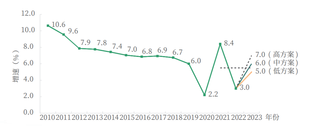 宏觀經(jīng)濟(jì)方面,受地緣政治事件和金融風(fēng)險(xiǎn)上升拖累,全球經(jīng)濟(jì)增速進(jìn)一步放緩。疫情防控措施加快優(yōu)化調(diào)整,疫情對經(jīng)濟(jì)的影響將顯著減小;存量、增量宏觀政策疊加發(fā)力,加之基數(shù)效應(yīng)明顯,預(yù)計(jì)2023年我國經(jīng)濟(jì)運(yùn)行有望整體明顯好轉(zhuǎn)??紤]國際經(jīng)濟(jì)、疫情形勢、房地產(chǎn)政策效果等不確定因素設(shè)置高、中、低三個(gè)方案對經(jīng)濟(jì)進(jìn)行預(yù)測,預(yù)計(jì)2023年GDP分別增長5.0%、6.0%、7.0%,兩年平均增速分別為4.0%、4.5%、5.0%。中方案下,三次產(chǎn)業(yè)增速分別為5.0%、5.9%和6.3%,四個(gè)季度GDP增速分別為4.5%、8.1%、5.5%、6.0%,兩年平均增速分別為4.6%、4.2%、4.7%、4.8%。
